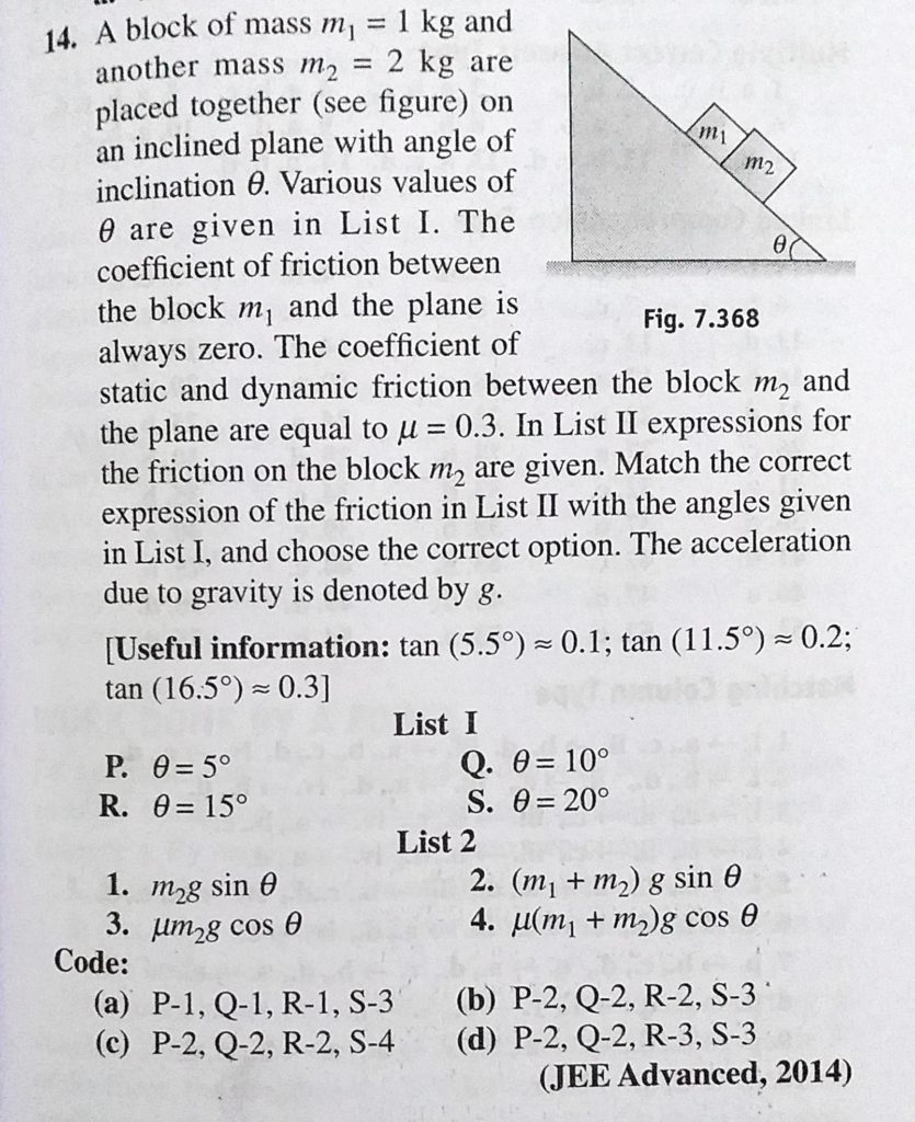 A block of mass m1 = 1 kg and another mass m2 = 2 kg are placed together (see figure) on an inclined plane with angle of inclination theta. Various values of theta are given in List 1. A block of mass m1 = 1 kg and another mass m2 = 2 kg are placed together (see figure) on an inclined plane with angle of inclination theta. Various values of theta are given in List 1. October 2, 2020 Category: Uncategorised (JEE Advanced Physics by BM Sharma + GMP Solutions) , Facebook Messenger WhatsApp Share this:TwitterFacebook Related