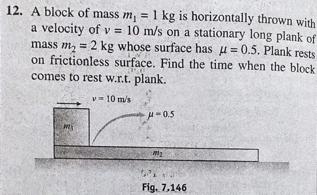 A block of mass m1 = 1 kg is horizontally thrown with a velocity of v = 10 m/s on a stationary long plank of mass m2 = 2 kg whose surface has mu = 0.5. Plank rests on frictionless surface. A block of mass m1 = 1 kg is horizontally thrown with a velocity of v = 10 m/s on a stationary long plank of mass m2 = 2 kg whose surface has mu = 0.5. Plank rests on frictionless surface. September 30, 2020 Category: Uncategorised (JEE Advanced Physics by BM Sharma + GMP Solutions) , Facebook Messenger WhatsApp Share this:TwitterFacebook Related