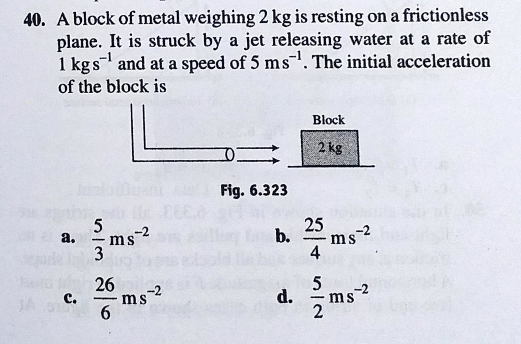 A block of metal weighing 2 kg is resting on a frictionless plane. It is struck by a jet releasing water at a rate of 1 kg/s and at a speed of 5 m/s. The initial acceleration of the block is A block of metal weighing 2 kg is resting on a frictionless plane. It is struck by a jet releasing water at a rate of 1 kg/s and at a speed of 5 m/s. The initial acceleration of the block is September 29, 2020 Category: Uncategorised (JEE Advanced Physics by BM Sharma + GMP Solutions) , Facebook Messenger WhatsApp Share this:TwitterFacebook Related
