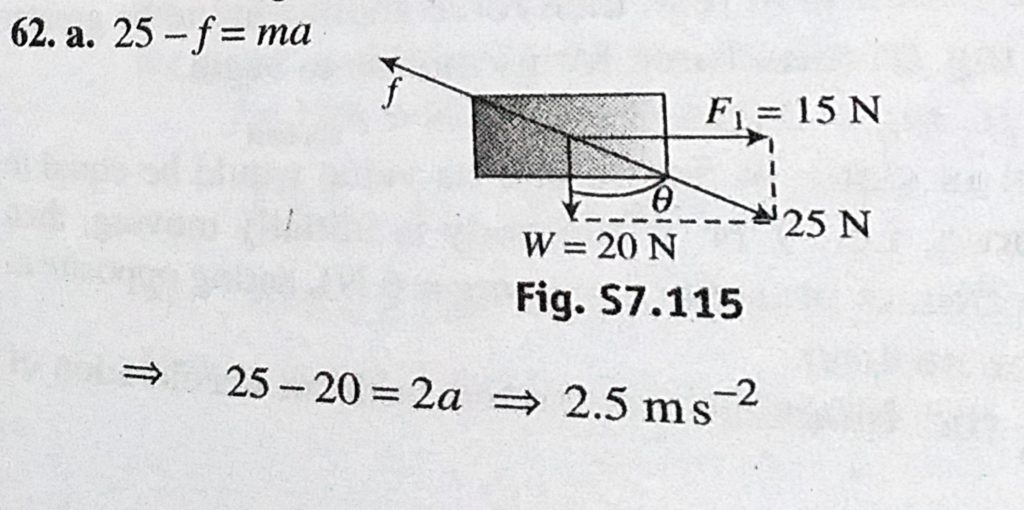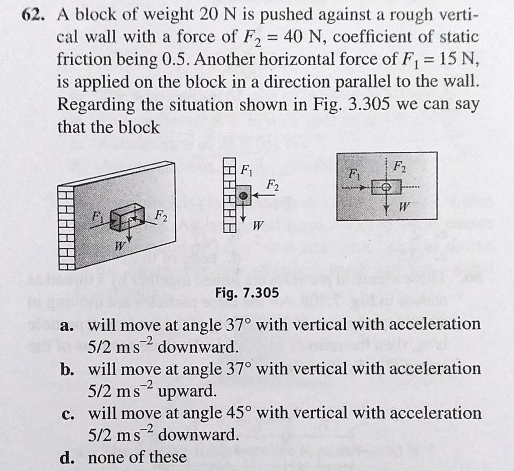 A block of weight 20 N is pushed against a rough vertical wall with a force of F2 = 40 N, coefficient of static friction being 0.5. Another horizontal force of F1 = 15 N, is applied on the block in a direction parallel A block of weight 20 N is pushed against a rough vertical wall with a force of F2 = 40 N coefficient of static friction being 0.5. Another horizontal force of F1 = 15 N is applied on the block in a direction parallel October 1, 2020 Category: Uncategorised (JEE Advanced Physics by BM Sharma + GMP Solutions) , Facebook Messenger WhatsApp Share this:TwitterFacebook Related