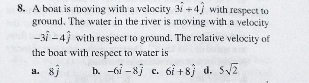 A boat is moving with a velocity 3i + 4j with respect to ground. The water in the river is moving with a velocity -3i – 4j with respect to ground. The relative velocity of the boat with respect to water Rain is falling vertically with a velocity of 25 m/s. A woman rides a bicycle with a speed of 10 m/s in the north to south direction. What is the direction (angle with vertical) in which she should September 22, 2020 Category: Uncategorised (JEE Advanced Physics by BM Sharma + GMP Solutions) , Facebook Messenger WhatsApp Share this:TwitterFacebook Related