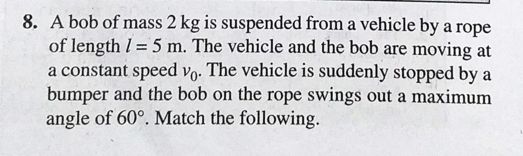 A bob of mass 2 kg is suspended from a vehicle by a rope of length l = 5 m. The vehicle and the bob are moving at a constant speed v0. The vehicle is suddenly stopped by a bumper and the bob A bob of mass 2 kg is suspended from a vehicle by a rope of length l = 5 m. The vehicle and the bob are moving at a constant speed v0. The vehicle is suddenly stopped by a bumper and the bob October 4, 2020 Category: Uncategorised (JEE Advanced Physics by BM Sharma + GMP Solutions) , Facebook Messenger WhatsApp Share this:TwitterFacebook Related