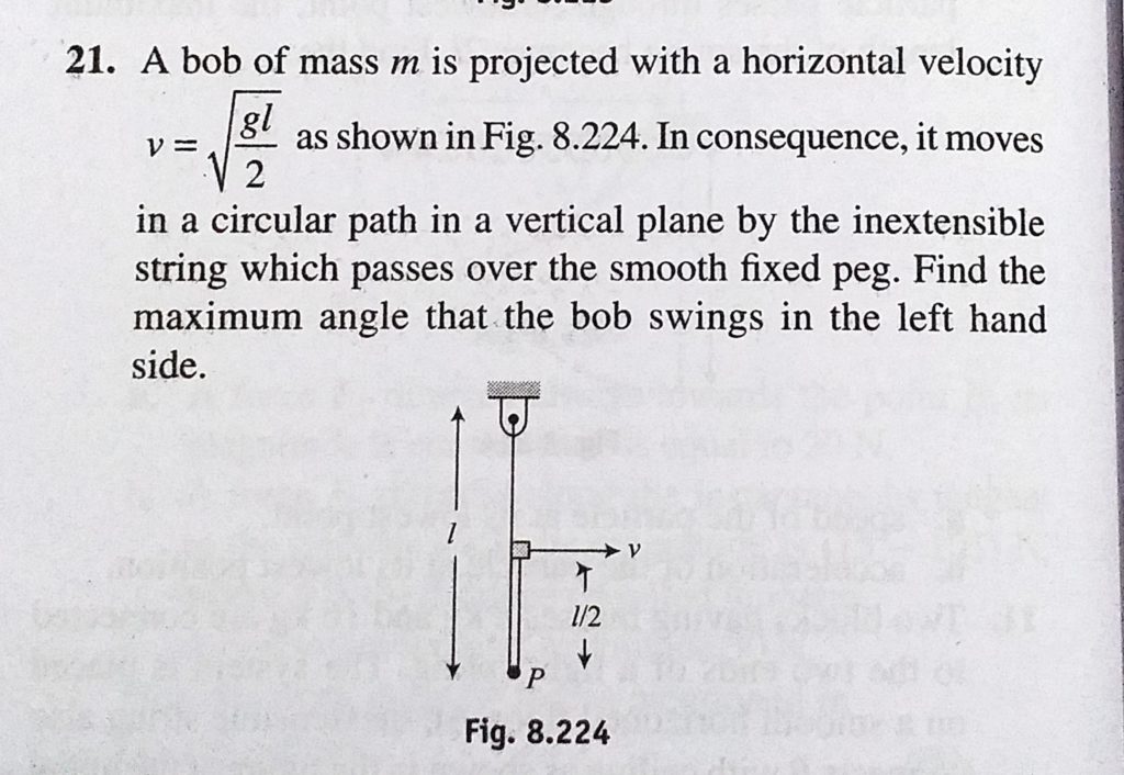 A bob of mass m is projected with a horizontal velocity v = root gl/2 as shown in Fig. 8.224. In consequence, it moves in a circular path in a vertical plane by the inextensible string which passes A bob of mass m is projected with a horizontal velocity v = root gl/2 as shown in Fig. 8.224. In consequence it moves in a circular path in a vertical plane by the inextensible string which passes October 3, 2020 Category: Uncategorised (JEE Advanced Physics by BM Sharma + GMP Solutions) , Facebook Messenger WhatsApp Share this:TwitterFacebook Related