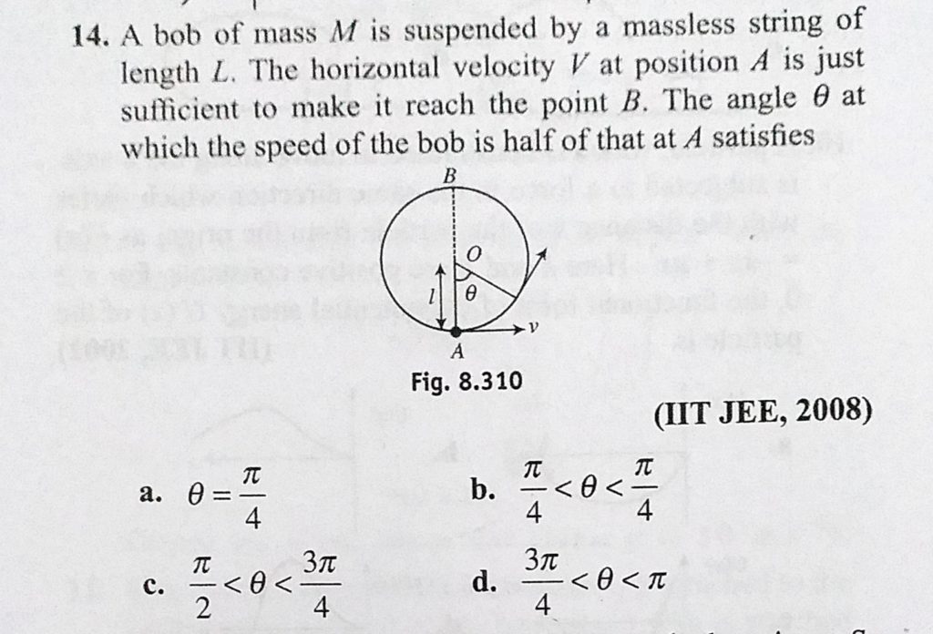 A bob of mass M is suspended by a massless string of length L. The horizontal velocity V at position A is just sufficient to make it reach the point b. The angle theta at which the speed of the bob A bob of mass M is suspended by a massless string of length L. The horizontal velocity V at position A is just sufficient to make it reach the point b. The angle theta at which the speed of the bob October 5, 2020 Category: Uncategorised (JEE Advanced Physics by BM Sharma + GMP Solutions) , Facebook Messenger WhatsApp Share this:TwitterFacebook Related