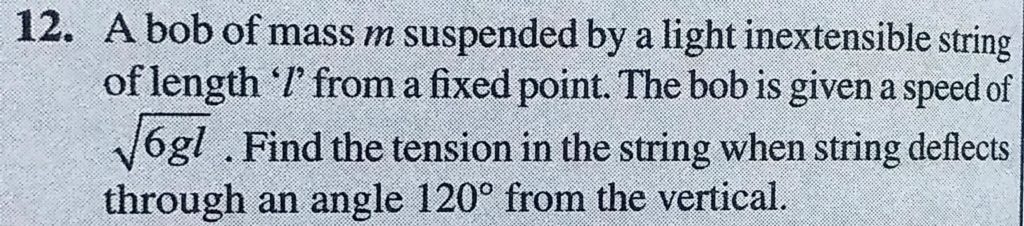 A bob of mass m suspended by a light inextensible string of length l from a fixed point. The bob is given a speed of root 6 gl. Find the tension in the string when string deflects through A bob of mass m suspended by a light inextensible string of length l from a fixed point. The bob is given a speed of root 6 gl. Find the tension in the string when string deflects through October 3, 2020 Category: Uncategorised (JEE Advanced Physics by BM Sharma + GMP Solutions) , Facebook Messenger WhatsApp Share this:TwitterFacebook Related