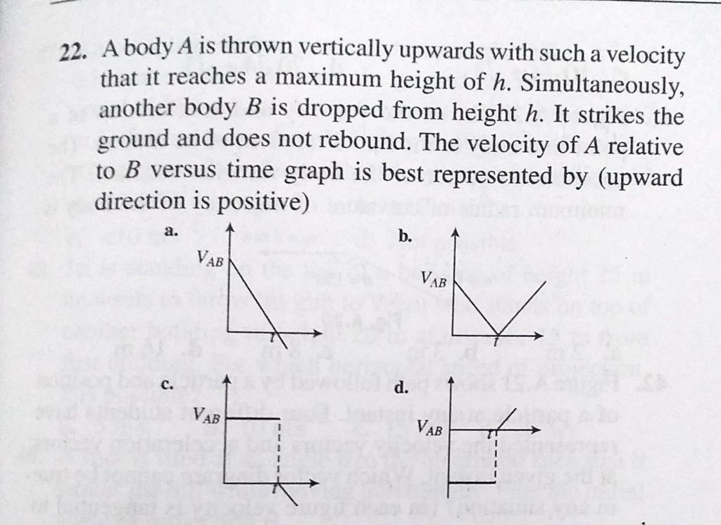 A body A is thrown vertically upwards with such a velocity that it reaches a maximum height of h. Simultaneously, another body B is dropped from height h. It strikes the ground and does not rebound. A body A is thrown vertically upwards with such a velocity that it reaches a maximum height of h. Simultaneously another body B is dropped from height h. It strikes the ground and does not rebound. September 24, 2020 Category: Uncategorised (JEE Advanced Physics by BM Sharma + GMP Solutions) , Facebook Messenger WhatsApp Share this:TwitterFacebook Related