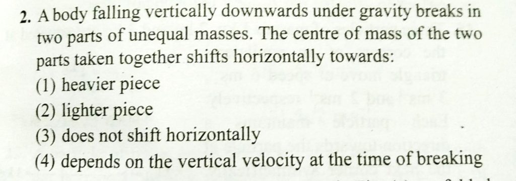 A body falling vertically downwards under gravity breaks in two parts of unequal masses. The centre of mass of the two parts together shifts horizontally towards A body falling vertically downwards under gravity breaks in two parts of unequal masses. The centre of mass of the two parts together shifts horizontally towards September 20, 2020 Category: Uncategorised (JEE Advanced Physics by BM Sharma + GMP Solutions) , Facebook Messenger WhatsApp Share this:TwitterFacebook Related