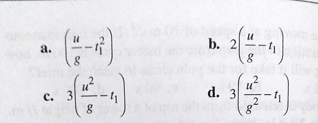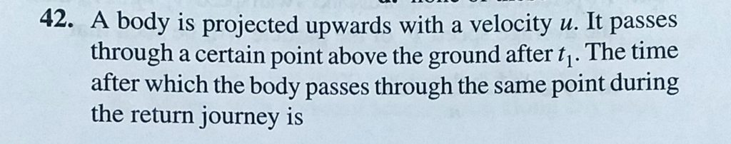 A body is projected upwards with a velocity u. It passes through a certain point above the ground after t1. The time after which the body passes through the same point during the return A body is projected upwards with a velocity u. It passes through a certain point above the ground after t1. The time after which the body passes through the same point during the return September 19, 2020 Category: Uncategorised (JEE Advanced Physics by BM Sharma + GMP Solutions) , Facebook Messenger WhatsApp Share this:TwitterFacebook Related