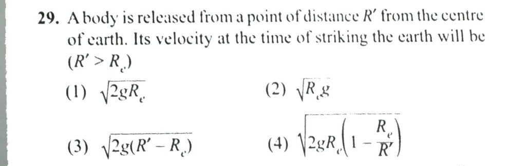 A body is released from a point of distance R’ from the centre of the earth. Its velocity at the time of striking the earth will be (R ′ >R e ). A body is released from a point of distance R' from the centre of the earth. Its velocity at the time of striking the earth will be (R ′ >R e ). October 3, 2020 Category: Uncategorised (JEE Advanced Physics by BM Sharma + GMP Solutions) , Facebook Messenger WhatsApp Share this:TwitterFacebook Related