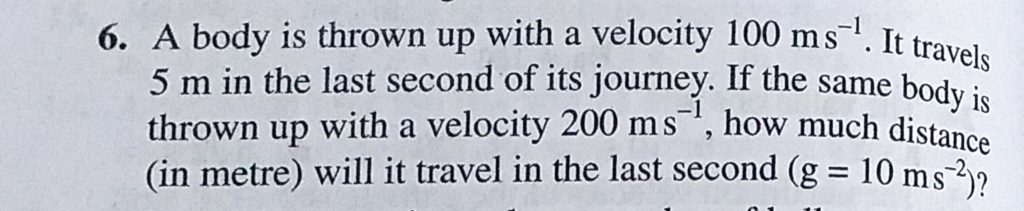 A body is thrown up with a velocity 100 m/s. It travels 5 m in the last second of its journey. If the same body is thrown up with a velocity 200 m/s, how much distance (in metre) will it travel in A body is thrown up with a velocity 100 m/s. It travels 5 m in the last second of its journey. If the same body is thrown up with a velocity 200 m/s how much distance (in metre) will it travel in September 19, 2020 Category: Uncategorised (JEE Advanced Physics by BM Sharma + GMP Solutions) , Facebook Messenger WhatsApp Share this:TwitterFacebook Related