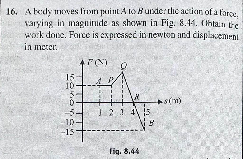 A body moves from point A to B under the action of a force, varying in magnitude as shown in Fig. 8.44. Obtain the work done. Force is expressed in newton and displacement in meter. A body moves from point A to B under the action of a force varying in magnitude as shown in Fig. 8.44. Obtain the work done. Force is expressed in newton and displacement in meter. October 2, 2020 Category: Uncategorised (JEE Advanced Physics by BM Sharma + GMP Solutions) , Facebook Messenger WhatsApp Share this:TwitterFacebook Related