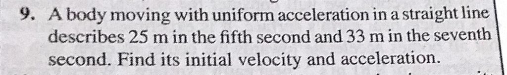 A body moving with uniform acceleration in a straight line describes 25 m in the fifth second and 33 m in the seventh second. Find its initial velocity and acceleration. A body moving with uniform acceleration in a straight line describes 25 m in the fifth second and 33 m in the seventh second. Find its initial velocity and acceleration. September 18, 2020 Category: Uncategorised (JEE Advanced Physics by BM Sharma + GMP Solutions) , Facebook Messenger WhatsApp Share this:TwitterFacebook Related