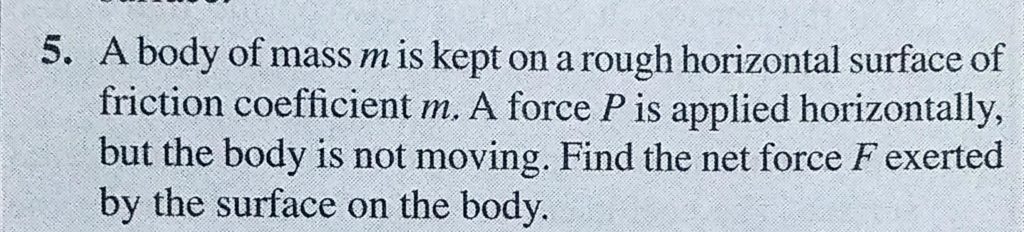 A body of mass m is kept on a rough horizontal surface of friction coefficient m. A force P is applied horizontally, but the body is not moving . Find the net force F exerted by the surface A body of mass m is kept on a rough horizontal surface of friction coefficient m. A force P is applied horizontally but the body is not moving . Find the net force F exerted by the surface September 30, 2020 Category: Uncategorised (JEE Advanced Physics by BM Sharma + GMP Solutions) , Facebook Messenger WhatsApp Share this:TwitterFacebook Related