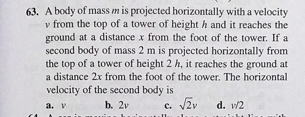 A body of mass m is projected horizontally with a velocity v from the top of a tower of height h and it reaches the ground at a distance x from the foot of the tower. If a second body of mass 2 m is A body of mass m is projected horizontally with a velocity v from the top of a tower of height h and it reaches the ground at a distance x from the foot of the tower. If a second body of mass 2 m is September 24, 2020 Category: Uncategorised (JEE Advanced Physics by BM Sharma + GMP Solutions) , Facebook Messenger WhatsApp Share this:TwitterFacebook Related