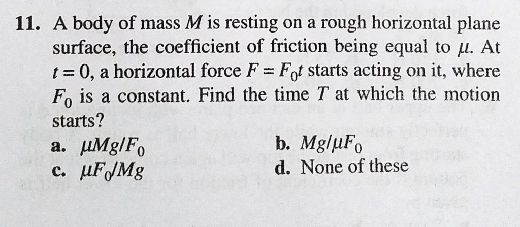A body of mass M is resting on a rough horizontal plane surface, the coefficient of friction being equal to muon. At t = 0, a horizontal force F = F0t starts acting on it, where F0 is a constant. A body of mass M is resting on a rough horizontal plane surface a horizontal force F = F0t starts acting on it the coefficient of friction being equal to muon. At t = 0 where F0 is a constant. October 1, 2020 Category: Uncategorised (JEE Advanced Physics by BM Sharma + GMP Solutions) , Facebook Messenger WhatsApp Share this:TwitterFacebook Related