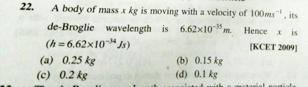 A body of mass x kg is moving with a velocity of 100 m/s, its de – Broglie wavelength is 6.62 x 10^-35 m. Hence x is A body of mass x kg is moving with a velocity of 100 m/s its de - Broglie wavelength is 6.62 x 10^-35 m. Hence x is November 27, 2020 Category: Uncategorised (JEE Advanced Physics by BM Sharma + GMP Solutions) , Facebook Messenger WhatsApp Share this:TwitterFacebook Related