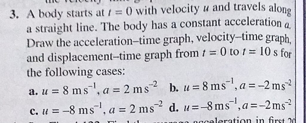 A body starts at t = 0 with velocity u and travels along a straight line. The body has a constant acceleration a. Draw the acceleration time graph, velocity time graph, and displacement time graph from A body starts at t = 0 with velocity u and travels along a straight line. The body has a constant acceleration a. Draw the acceleration time graph and displacement time graph from velocity time graph September 18, 2020 Category: Uncategorised (JEE Advanced Physics by BM Sharma + GMP Solutions) , Facebook Messenger WhatsApp Share this:TwitterFacebook Related