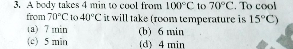 A body takes 4 min to cool from 100 degree C TO 70 degree C. To cool from 70 degree C to 40 degree C it will take ( room temperature is 15 degree C ) A body takes 4 min to cool from 100 degree C TO 70 degree C. To cool from 70 degree C to 40 degree C it will take ( room temperature is 15 degree C ) October 4, 2020 Category: Uncategorised (JEE Advanced Physics by BM Sharma + GMP Solutions) , Facebook Messenger WhatsApp Share this:TwitterFacebook Related