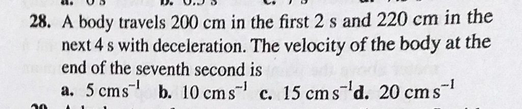 A body travels 200 cm in the first 2 s and 220 cm in the next 4 s with deceleration. The velocity of the body at the end of the seventh second is A body travels 200 cm in the first 2 s and 220 cm in the next 4 s with deceleration. The velocity of the body at the end of the seventh second is September 19, 2020 Category: Uncategorised (JEE Advanced Physics by BM Sharma + GMP Solutions) , Facebook Messenger WhatsApp Share this:TwitterFacebook Related
