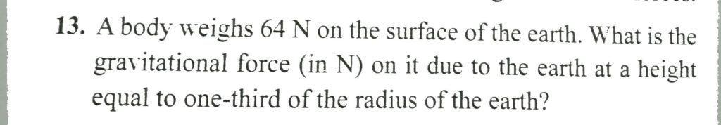 A body weighs 64 N on the surface of the earth. What is the gravitational force ( in N ) on it due to the earth at a height equal to one – third of the radius of the earth? A body weighs 64 N on the surface of the earth. What is the gravitational force ( in N ) on it due to the earth at a height equal to one - third of the radius of the earth? October 6, 2020 Category: Uncategorised (JEE Advanced Physics by BM Sharma + GMP Solutions) , Facebook Messenger WhatsApp Share this:TwitterFacebook Related