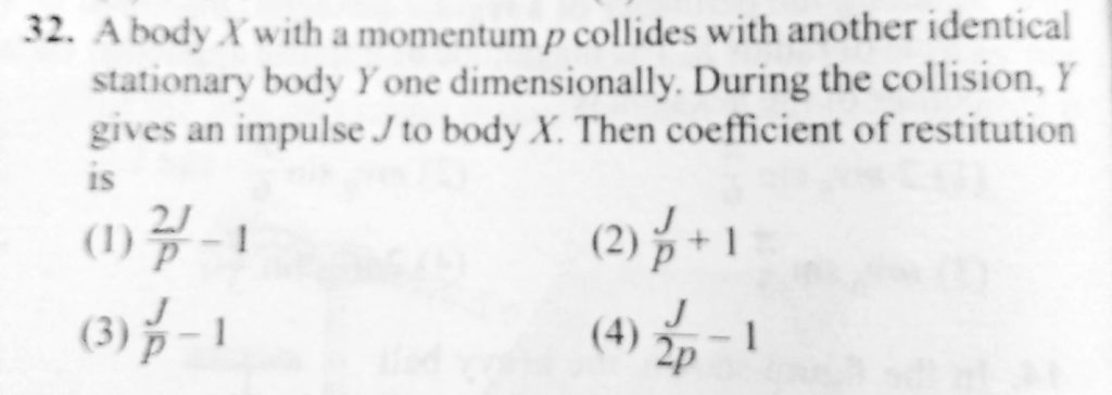 A body X with a momentum p collides with another identical stationary body Y one dimensionally. During the collision, Y gives an impulse J to body X. Then coefficient of restitution is A body X with a momentum p collides with another identical stationary body Y one dimensionally. During the collision Y gives an impulse J to body X. Then coefficient of restitution is September 24, 2020 Category: Uncategorised (JEE Advanced Physics by BM Sharma + GMP Solutions) , Facebook Messenger WhatsApp Share this:TwitterFacebook Related