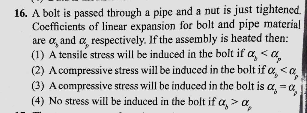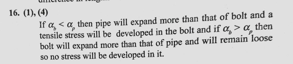 A bolt is passed through a pipe and a nut is just tightened. Coefficients of linear expansion for bolt and pipe material are alpha b and alpha p respectively. If the assembly is heated A bolt is passed through a pipe and a nut is just tightened. Coefficients of linear expansion for bolt and pipe material are alpha b and alpha p respectively. If the assembly is heated October 24, 2020 Category: Uncategorised (JEE Advanced Physics by BM Sharma + GMP Solutions) , Facebook Messenger WhatsApp Share this:TwitterFacebook Related