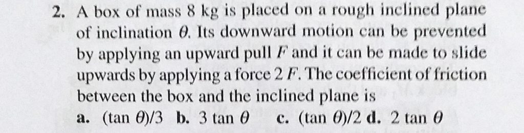 A box of mass 8 kg is placed on a rough inclined plane of inclination theta. Its downward motion can be prevented by applying an upward pull F and it can be made to slide upwards by applying a force 2 F. Calculate the maximum possible value of mass m0 of block C upto which block A will remain stationary relative to B. If the length of block B is equal to l = 50 cm and mass of block C is m3 = 2 m0 then calculate the time October 1, 2020 Category: Uncategorised (JEE Advanced Physics by BM Sharma + GMP Solutions) , Facebook Messenger WhatsApp Share this:TwitterFacebook Related