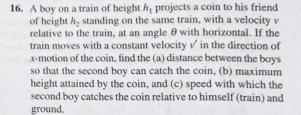 A boy on a train of height h1 projects a coin to his friend of height h2 standing on the same train, with a velocity v relative to the train, at an angle theta with horizontal. If the train moves A boy on a train of height h1 projects a coin to his friend of height h2 standing on the same train at an angle theta with horizontal. If the train moves with a velocity v relative to the train September 22, 2020 Category: Uncategorised (JEE Advanced Physics by BM Sharma + GMP Solutions) , Facebook Messenger WhatsApp Share this:TwitterFacebook Related