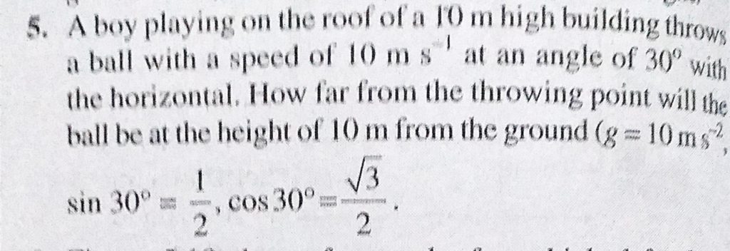 A boy playing on the roof of a 10 m high building throws a ball with a speed of 10 m/s at an angle of 30 with the horizontal. How far from the throwing point will the ball be at the A boy playing on the roof of a 10 m high building throws a ball with a speed of 10 m/s at an angle of 30 with the horizontal. How far from the throwing point will the ball be at the September 19, 2020 Category: Uncategorised (JEE Advanced Physics by BM Sharma + GMP Solutions) , Facebook Messenger WhatsApp Share this:TwitterFacebook Related