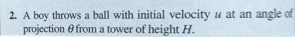 A boy throws a ball with initial velocity u at an angle of projection theta from a tower of height H. Neglecting the air resistance , find a. How high above the building the ball rises A boy throws a ball with initial velocity u at an angle of projection theta from a tower of height H. Neglecting the air resistance find a. How high above the building the ball rises October 2, 2020 Category: Uncategorised (JEE Advanced Physics by BM Sharma + GMP Solutions) , Facebook Messenger WhatsApp Share this:TwitterFacebook Related