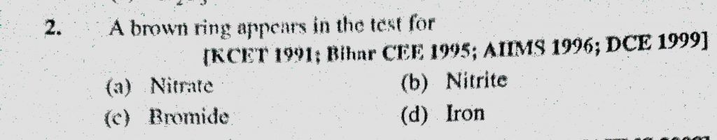 A brown ring appears in the test for (a) Nitrate (b) Nitrite (c) Bromide (d) Iron A brown ring appears in the test for (a) Nitrate (b) Nitrite (c) Bromide (d) Iron December 6, 2020 Category: Uncategorised (JEE Advanced Physics by BM Sharma + GMP Solutions) , Facebook Messenger WhatsApp Share this:TwitterFacebook Related