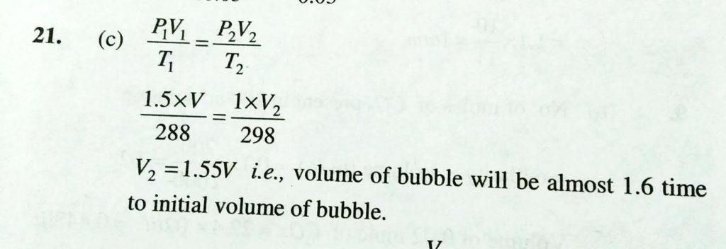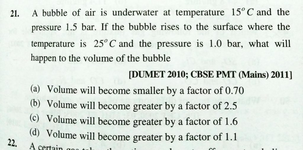 A bubble of air is underwater at temperature 15 ∘ C and the pressure 1.5 bar. If the bubble rises to the surface where the temperature is 25 ∘ C and the pressure is 1.0 bar, what will happen to the volume of the bubble? A bubble of air is underwater at temperature 15 ∘ C and the pressure 1.5 bar. If the bubble rises to the surface where the temperature is 25 ∘ C and the pressure is 1.0 bar what will happen to the volume of the bubble? February 10, 2021 Category: Uncategorised (JEE Advanced Physics by BM Sharma + GMP Solutions) , Facebook Messenger WhatsApp Share this:TwitterFacebook Related
