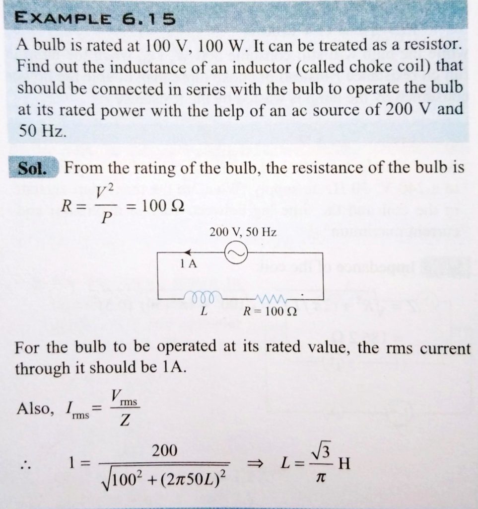 A bulb is rated at 100 V, 100 W. It can be treated as a resistor. Find out the inductance of an inductor (called choke coil) that should be connected in series with the bulb at its rated power with the help of an ac source of 200 V and 50 Hz. A bulb is rated at 100 V a constant current 2.5 A flows. When the same inductor coil is connected to an ac source of 10 V and 50 Hz then the current is 2 A. Find out the indutance of the coil. When an inductor coil is connected to an ideal battery of emf 10 V September 8, 2020 Category: Uncategorised (JEE Advanced Physics by BM Sharma + GMP Solutions) , Facebook Messenger WhatsApp Share this:TwitterFacebook Related