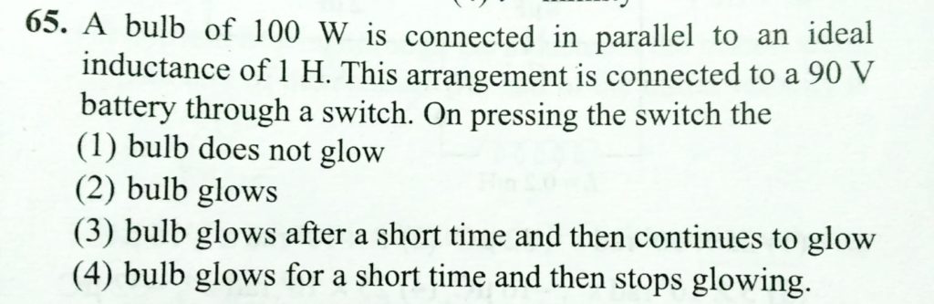 A bulb of 100 W is connected in parallel to an ideal inductance of 1 H . This arrangement is connected to a 90 V battery through a switch . On pressing the switch the A bulb of 100 W is connected in parallel to an ideal inductance of 1 H . This arrangement is connected to a 90 V battery through a switch . On pressing the switch the October 24, 2020 Category: Uncategorised (JEE Advanced Physics by BM Sharma + GMP Solutions) , Facebook Messenger WhatsApp Share this:TwitterFacebook Related