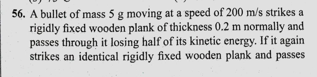 A bullet of mass 5 g moving at a speed of 200 m/s strikes a rigidly fixed wooden plank of thickness 0.2 m normally and passes through it losing half of its kinetic energy. If it again strikes an identical A mass m of lead shot is placed at the bottom of a vertical cardboard cylinder that is 1.5 m long and closed at both ends. The cylinder is suddenly inverted so that the shot falls 1.5 m. October 24, 2020 Category: Uncategorised (JEE Advanced Physics by BM Sharma + GMP Solutions) , Facebook Messenger WhatsApp Share this:TwitterFacebook Related