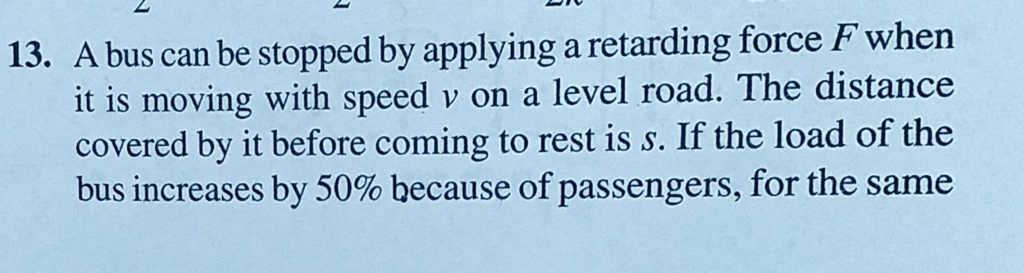 A bus can be stopped by applying a retarding force F when it is moving with speed v on a level road. The distance covered by it before coming to rest is s. If the load of the bus increased by 50 % A bus can be stopped by applying a retarding force F when it is moving with speed v on a level road. The distance covered by it before coming to rest is s. If the load of the bus increased by 50 % October 3, 2020 Category: Uncategorised (JEE Advanced Physics by BM Sharma + GMP Solutions) , Facebook Messenger WhatsApp Share this:TwitterFacebook Related