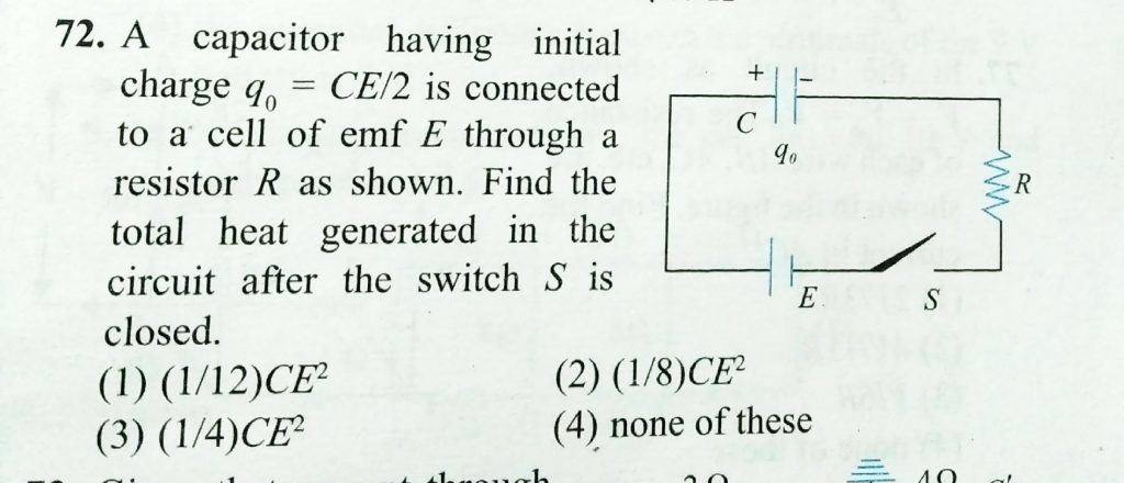 A capacitor having initial charge q0 = CE /2 is connected to a cell of emf E through a resistor R as shown . Find the total heat generated in the circuit after the switch S is closed. A capacitor having initial charge q0 = CE /2 is connected to a cell of emf E through a resistor R as shown . Find the total heat generated in the circuit after the switch S is closed. November 12, 2020 Category: Uncategorised (JEE Advanced Physics by BM Sharma + GMP Solutions) , Facebook Messenger WhatsApp Share this:TwitterFacebook Related