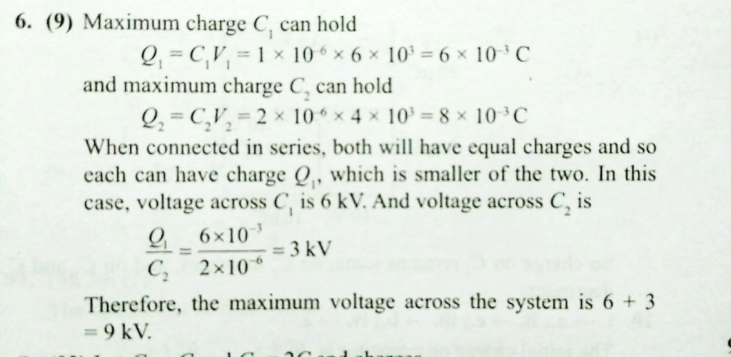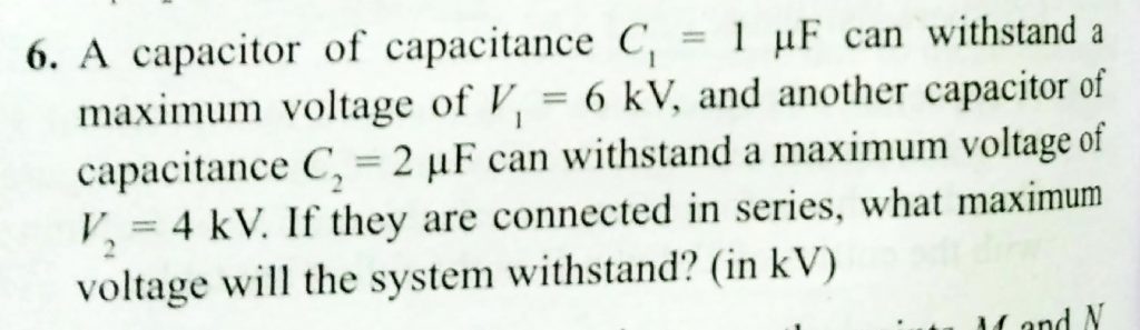 A capacitor of capacitance C 1= 1.0 μF withstands the maximum voltage V1 = 6.0 kV while a capacitor of capacitance Cs = 2.0μF, the maximum voltage Vs = 4.0 kV. What voltage will the system of these two capacitors withsatand if they are connected in sereis ?