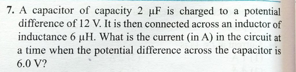 A capacitor of capacity 2 μF is charged to a potential difference of 12 V. It is then connected across an inductor of inductance 6μH. What is the current (in A) in the circuit at a time when the potential difference across the capacitor is 6.0 V? A current of 2 A is increasing at a rate of 4 A/s through a coil of inductance 1 H. Find the energy stored in the inductor per unit in the units of J/s. October 24, 2020 Category: Uncategorised (JEE Advanced Physics by BM Sharma + GMP Solutions) , Facebook Messenger WhatsApp Share this:TwitterFacebook Related