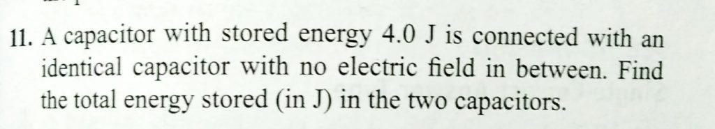 A capacitor with stored energy 4 J is connected with an identical capacitor with no electric field in between . Find the total energy stored ( in J ) in the two capacitors. A capacitor with stored energy 4 J is connected with an identical capacitor with no electric field in between . Find the total energy stored ( in J ) in the two capacitors. November 10, 2020 Category: Uncategorised (JEE Advanced Physics by BM Sharma + GMP Solutions) , Facebook Messenger WhatsApp Share this:TwitterFacebook Related