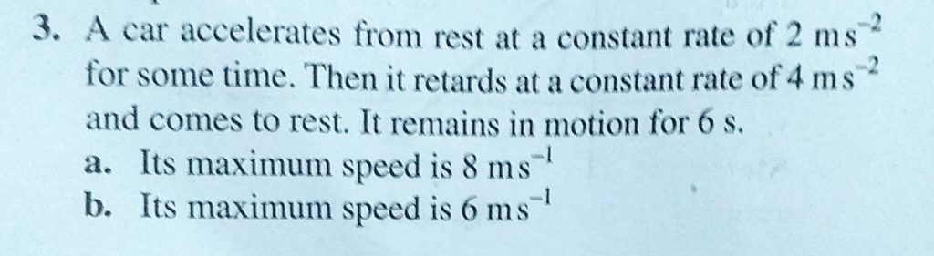 A car accelerates from rest at a constant rate of 2 m/s^2 for some time. Then it retards at at a constant rate of 4 m/s^2 and comes to rest. It remains in motion for 6 s. A car accelerates from rest at a constant rate of 2 m/s^2 for some time. Then it retards at at a constant rate of 4 m/s^2 and comes to rest. It remains in motion for 6 s. September 19, 2020 Category: Uncategorised (JEE Advanced Physics by BM Sharma + GMP Solutions) , Facebook Messenger WhatsApp Share this:TwitterFacebook Related