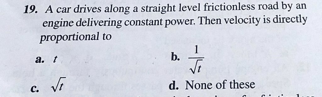A car drives along a straight level frictionless road by an engine delivering constant power. Then velocity is directly proportional to A car drives along a straight level frictionless road by an engine delivering constant power. Then velocity is directly proportional to October 3, 2020 Category: Uncategorised (JEE Advanced Physics by BM Sharma + GMP Solutions) , Facebook Messenger WhatsApp Share this:TwitterFacebook Related