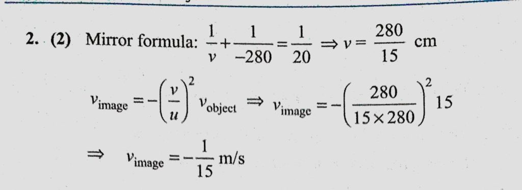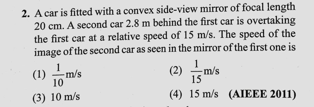 A car is fitted with a convex side-view mirror of focal length 20 cm. A second car 2.8 m behind the first car is overtaking the first car at a relative speed of 15 m/s. The speed of the image A car is fitted with a convex side-view mirror of focal length 20 cm. A second car 2.8 m behind the first car is overtaking the first car at a relative speed of 15 m/s. The speed of the image October 7, 2020 Category: Uncategorised (JEE Advanced Physics by BM Sharma + GMP Solutions) , Facebook Messenger WhatsApp Share this:TwitterFacebook Related