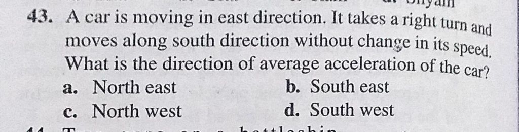 A car is moving in east direction. It takes a right turn and move along south direction without change in its speed. What is the direction of average acceleration of the car? A car is moving in east direction. It takes a right turn and move along south direction without change in its speed. What is the direction of average acceleration of the car? September 24, 2020 Category: Uncategorised (JEE Advanced Physics by BM Sharma + GMP Solutions) , Facebook Messenger WhatsApp Share this:TwitterFacebook Related