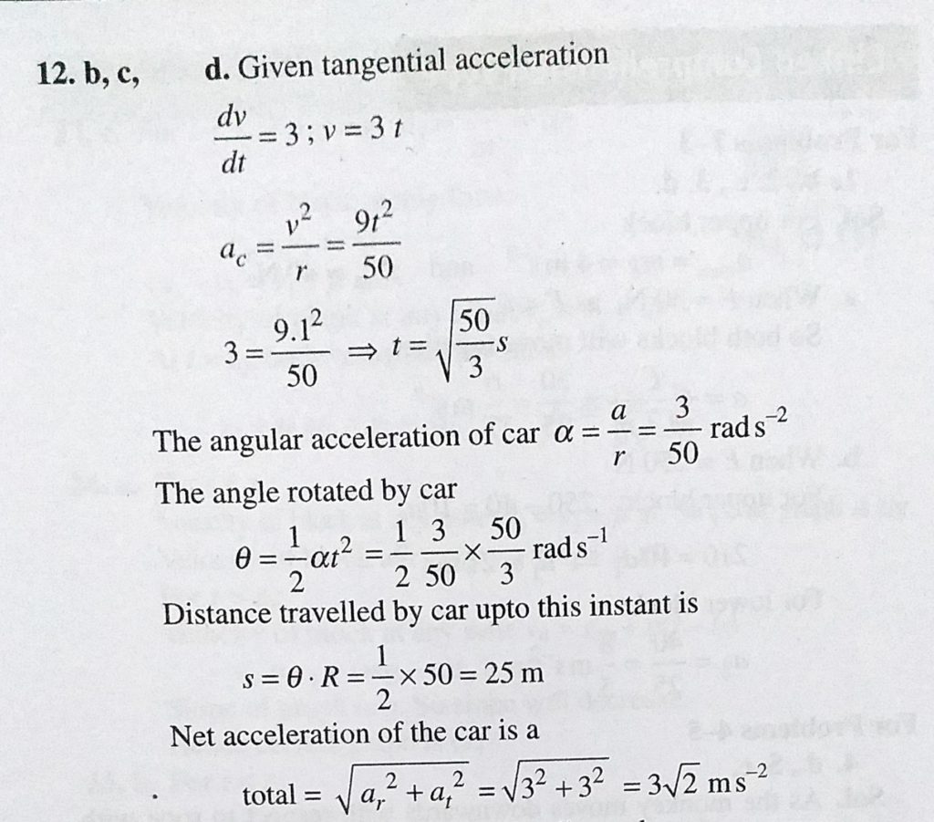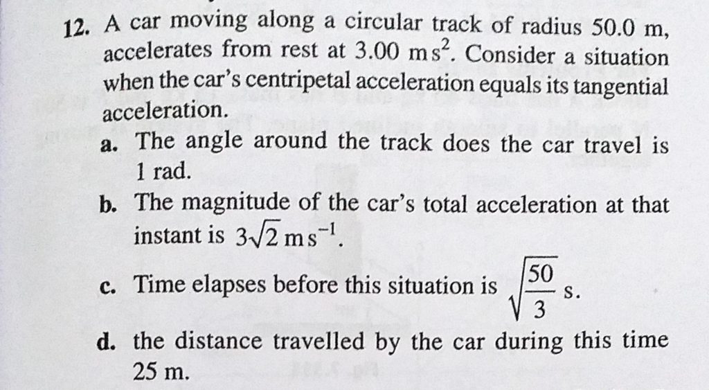 A car moving along a circular track of radius 50.0 m, accelerates from rest at 3.00 m/s^2. Consider a situation when the car’s centripetal acceleration equals its tangential acceleration. A car moving along a circular track of radius 50.0 m accelerates from rest at 3.00 m/s^2. Consider a situation when the car's centripetal acceleration equals its tangential acceleration. October 1, 2020 Category: Uncategorised (JEE Advanced Physics by BM Sharma + GMP Solutions) , Facebook Messenger WhatsApp Share this:TwitterFacebook Related