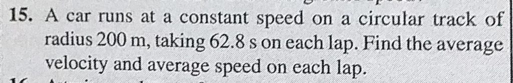 A car runs at a constant speed on a circular track of radius 200 m, taking 62.8 s each lap. Find the average velocity and average speed on each lap. A car runs at a constant speed on a circular track of radius 200 m taking 62.8 s each lap. Find the average velocity and average speed on each lap. September 18, 2020 Category: Uncategorised (JEE Advanced Physics by BM Sharma + GMP Solutions) , Facebook Messenger WhatsApp Share this:TwitterFacebook Related