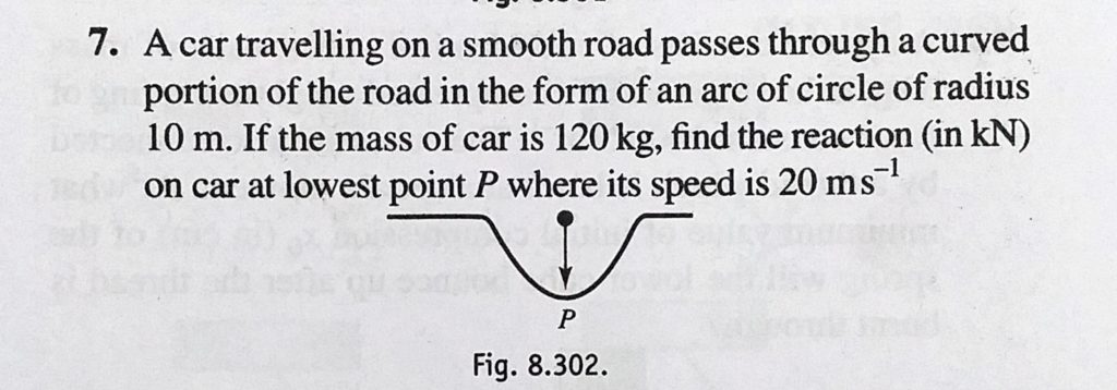 A car travelling on a smooth road passes through a curved portion of the road in the form of an arc of circle of radius 10 m. If the mass of car is 120 kg, find the reaction ( in kN) on car at lowest point A car travelling on a smooth road passes through a curved portion of the road in the form of an arc of circle of radius 10 m. If the mass of car is 120 kg find the reaction ( in kN) on car at lowest point October 5, 2020 Category: Uncategorised (JEE Advanced Physics by BM Sharma + GMP Solutions) , Facebook Messenger WhatsApp Share this:TwitterFacebook Related