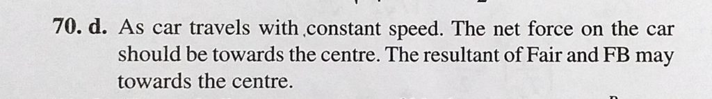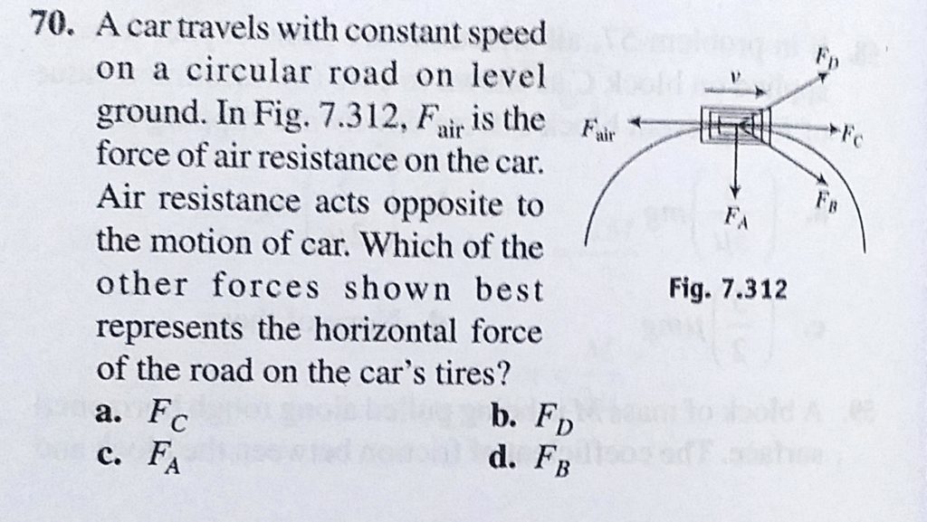 A car travels with constant speed on a circular road on level ground. In Fig. 7.312, Fair is the force of air resistance acts opposite to the motion of car. Which of the other forces shown best A car travels with constant speed on a circular road on level ground. In Fig. 7.312 Fair is the force of air resistance acts opposite to the motion of car. Which of the other forces shown best October 1, 2020 Category: Uncategorised (JEE Advanced Physics by BM Sharma + GMP Solutions) , Facebook Messenger WhatsApp Share this:TwitterFacebook Related