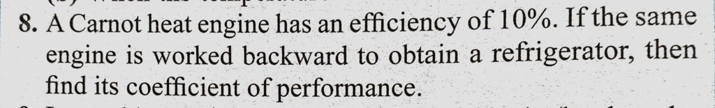 A Carnot heat engine has an efficiency of 10%. If the same engine is worked backward to obtain a refrigerator, then find its coefficient of performance. A Carnot heat engine has an efficiency of 10%. If the same engine is worked backward to obtain a refrigerator then find its coefficient of performance. October 28, 2020 Category: Uncategorised (JEE Advanced Physics by BM Sharma + GMP Solutions) , Facebook Messenger WhatsApp Share this:TwitterFacebook Related