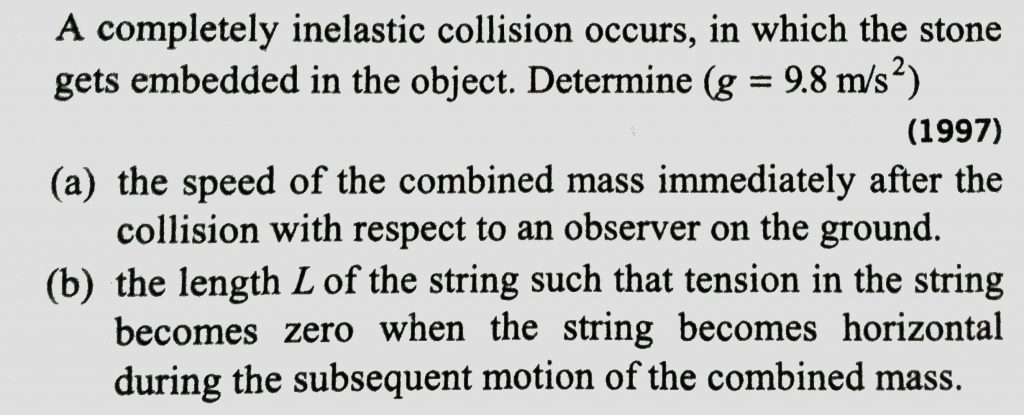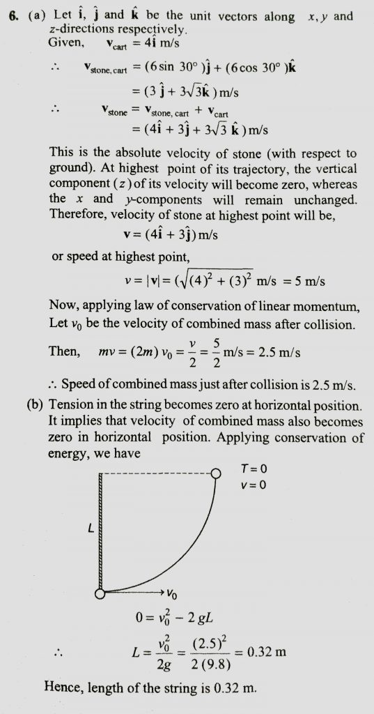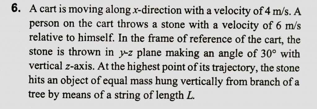 A cart is moving along +x direction with a velocityof 4m/s. A person on the cart throws a stone with a velocity of 6m/s relative to himself. In the frame of reference of the cart the stone is thrown in y-z plane making an angle of 30∘ with vertical z-axis. At the highest point of its trajectory, the stone hits an object of equal mass hung vertically from the branch of a tree by means of a string of length L
